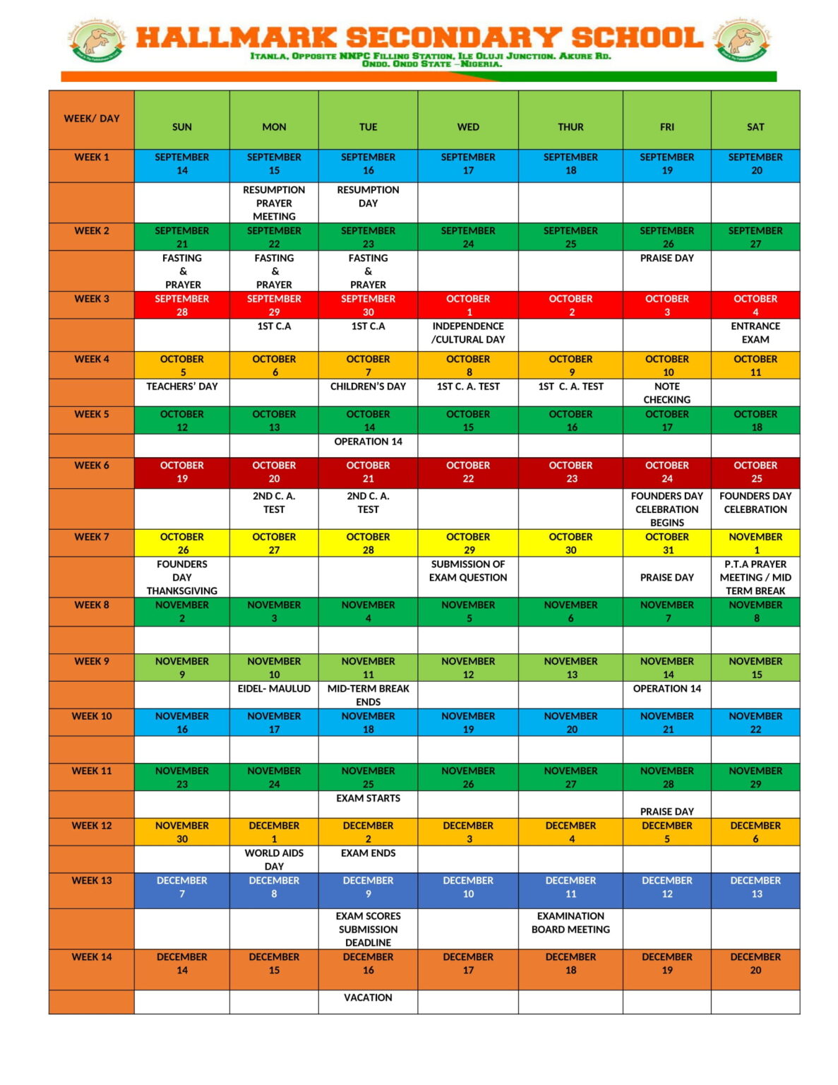 SCHOOL CALENDAR 1ST TERM 2025/2026 SESSION