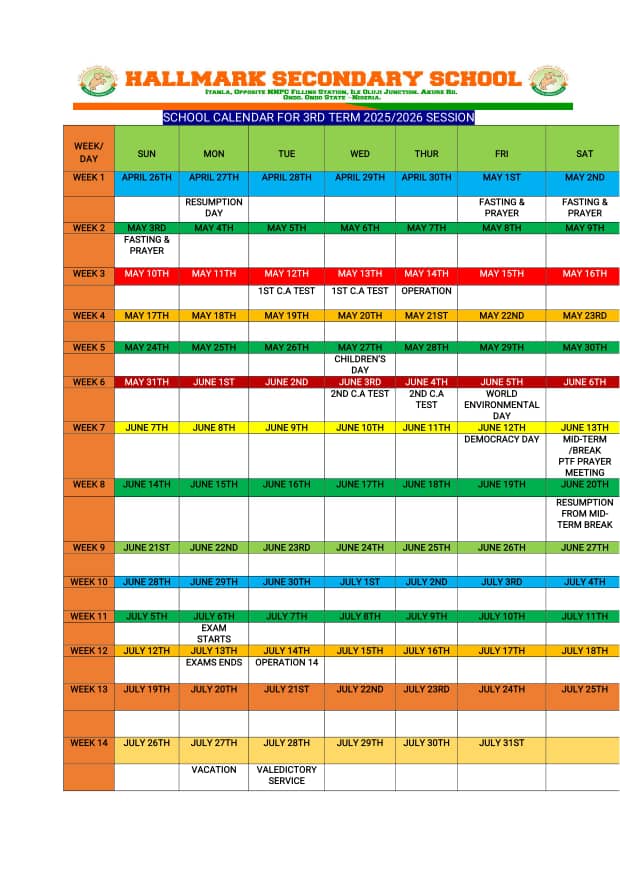 SCHOOL CALENDAR 3RD TERM 2025/2026 SESSION